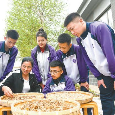 坐落于金溝屯鎮下營子村的熱河中藥花海小鎮內,幾名學生參加研學活動。于磊 攝