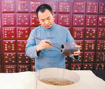 我出生于虞城縣劉集鄉蔡老家村,家中祖輩從事正骨,最引以為豪的是先輩傳承下來的筋骨散熱敷療法,這一療法集散、醋、熱、熨、敷五位為一體,用藥配方工藝復雜,從原材料篩選、醋制、酒制、碾碎、過苜再到裝袋成品,層層篩選把關,精確配伍。