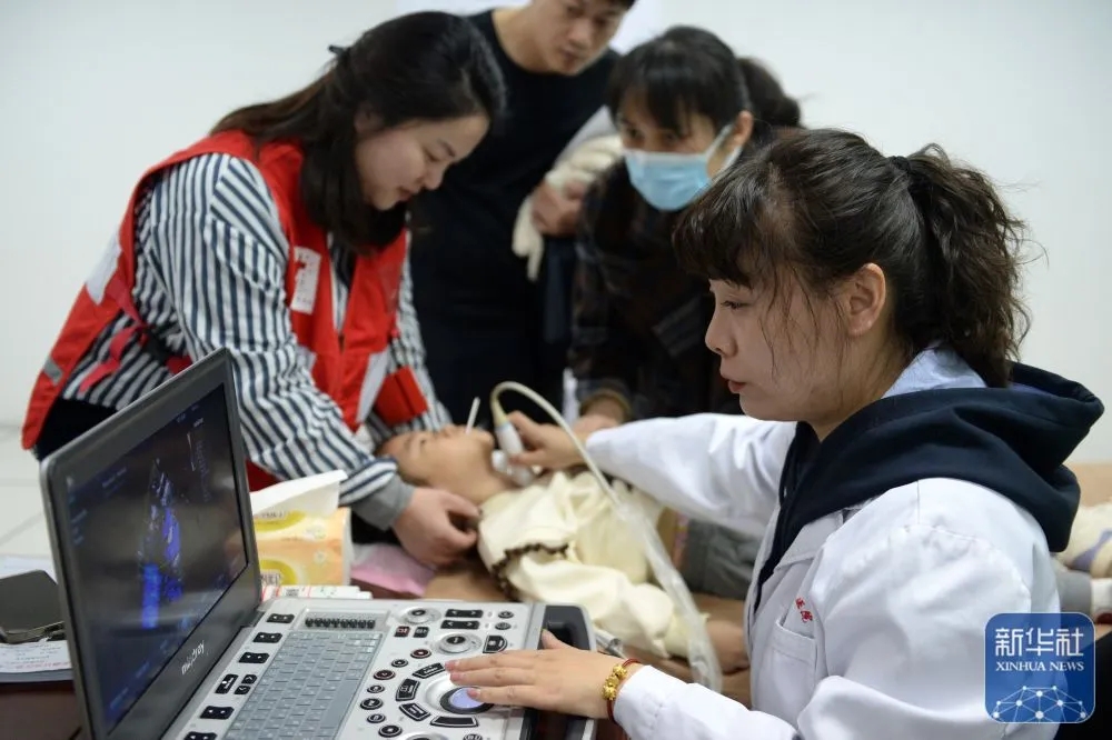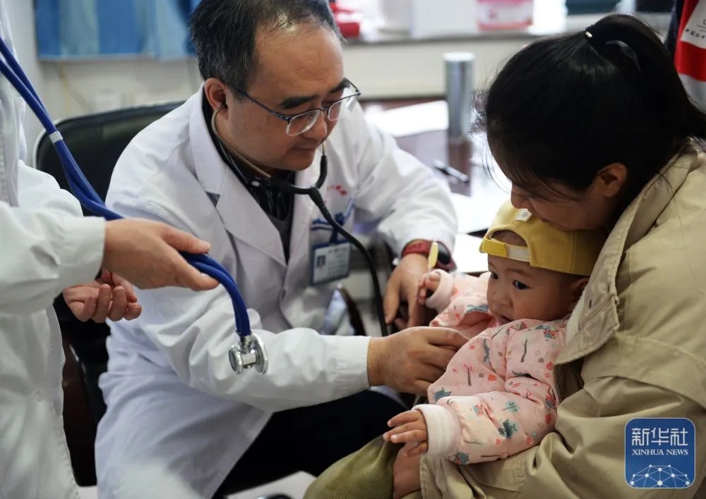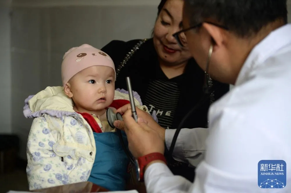 3月25日,在阿勒泰市婦幼保健院,濟南市中心醫院的醫療專家在給孩子做檢查。新華社記者 劉勇貞 攝影報道