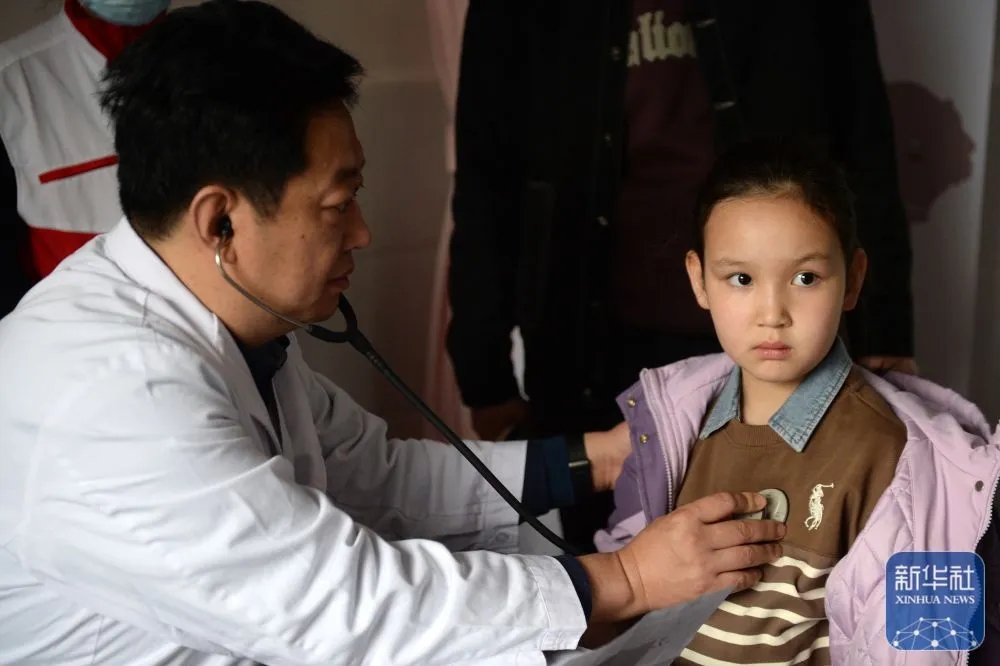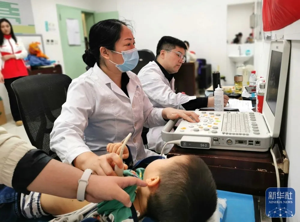 3月28日,在塔城地區人民醫院,濟南市中心醫院的醫療專家在給孩子做檢查。