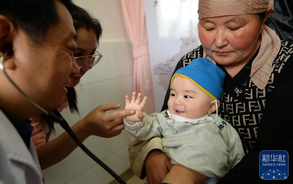 3月26日,在阿勒泰市婦幼保健院,濟南市中心醫院的醫療專家在給孩子做檢查。