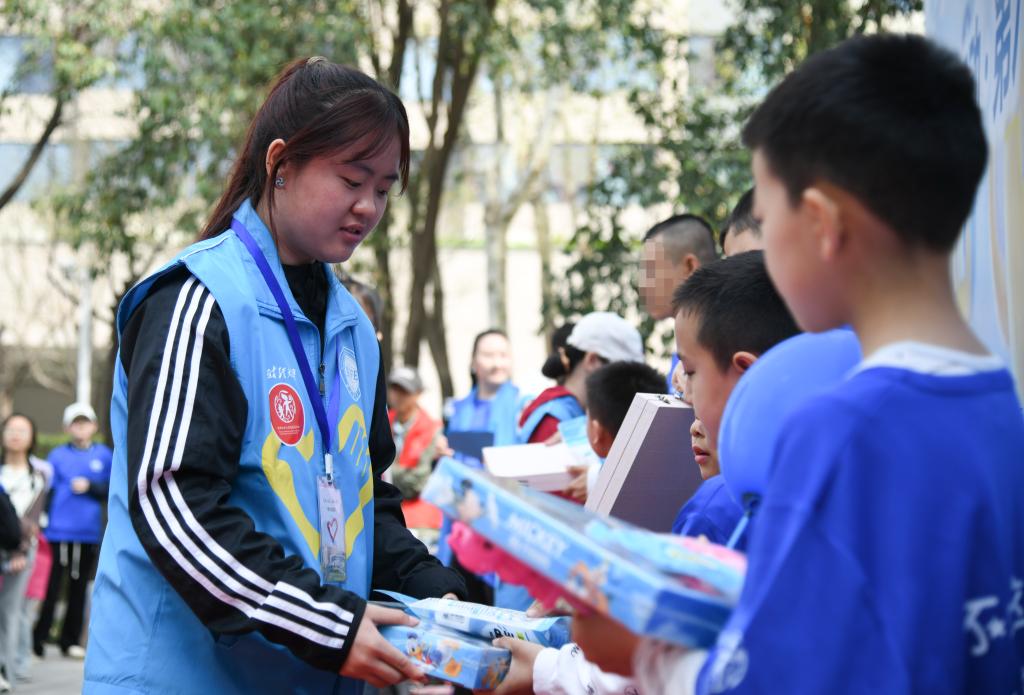 志愿者(左)向參與活動的孤獨癥兒童贈送禮物。張博文 攝