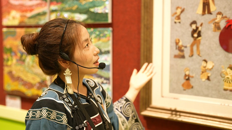 “這是一幅由內蒙古春蕾女童集體創作的玉米皮貼畫,這上面用的都是當地的玉米皮,展示了中華民族一家親、同心共筑中國夢的生動畫面!敝袊鴭D女兒童博物館內,身著彝族傳統服飾的依火伍牛正在向觀眾講解著春蕾女童的繪畫作品。