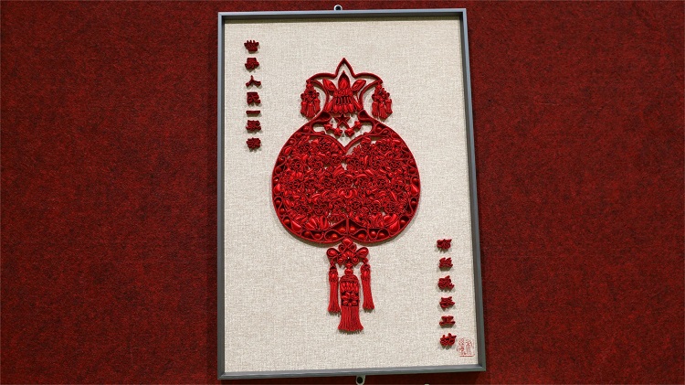 盤扣作品《世界人民一家親》以“團結”為設計理念,將石榴作為主體形象,運用手工盤扣技藝制作而成。石榴的果實部分由佩戴各民族不同頭飾的笑臉組成,象征著各族人民緊密相連、休戚與共,像石榴籽般緊緊團結在一起。