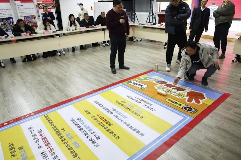 會場正中間鋪上了一張地貼圖,上面列滿數十條規則選項。地貼圖標有起始線,上面寫著“基線不能越”,邊緣紅線注明“紅線不能踩”。正當大家看得云里霧里時,主持人開始介紹游戲規則,原來這是一張“游戲圖”,每位參與者在起始線將紙筒推出,紙筒滾至哪一格,就要按格子內的文字做出相應解讀并完成指定任務,有獎亦有罰。