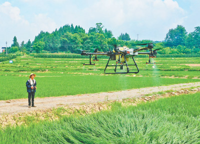 無人機對雨臺村稻田進行飛防作業。夏娟 攝(人民視覺)