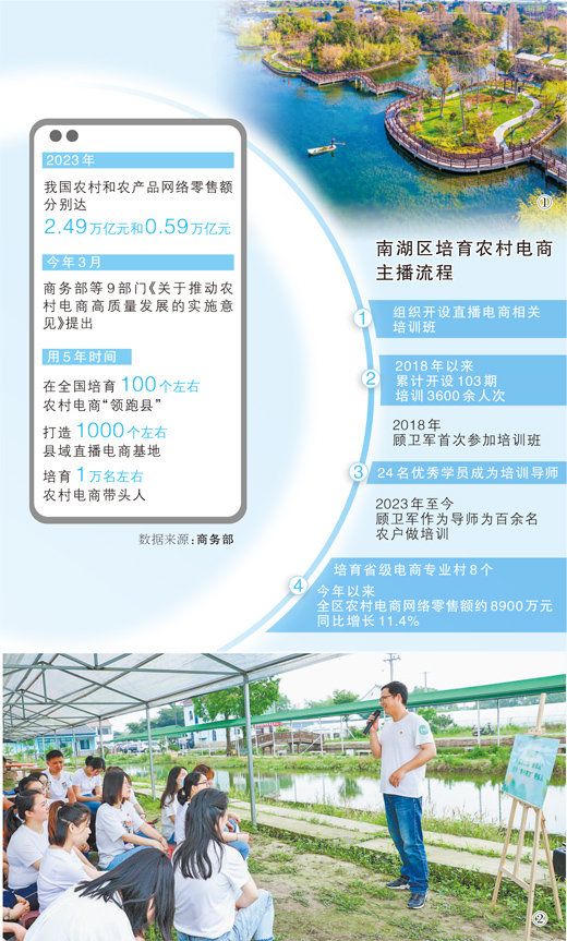 如今,顧衛軍所在的嘉興市南湖區,已培育出省級電商專業村8個。2018年以來,南湖區累計開設直播電商相關培訓班103期,吸引3600余人次報名學習;今年以來,全區農村電商網絡零售額約8900萬元,同比增長11.4%。