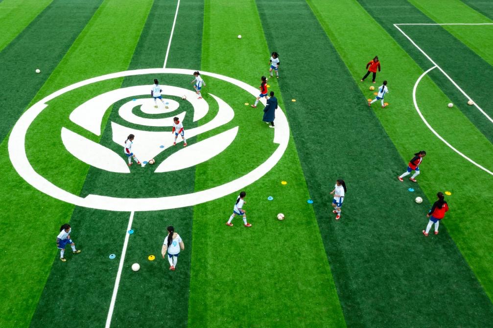 資料圖:瓦吾小學的女足隊員們在“玫瑰夢想球場”上訓練。新華社記者 沈伯韓 攝