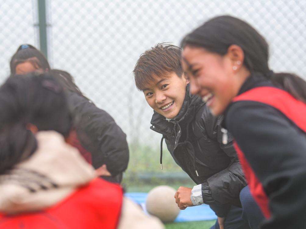 6月18日,王霜(右二)指導瓦吾小學女足隊員訓練。新華社記者 王曦 攝