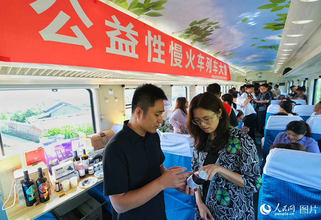 7月10日,鐵路網紅在4347次列車“公益性慢火車列車大集”上進行助農直播。楊寶森 攝