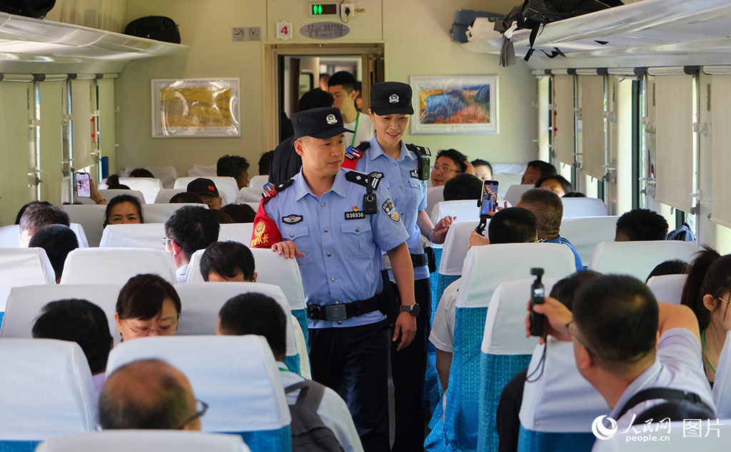 7月10日,4347次列車上乘警在車廂內流動巡視。楊寶森 攝