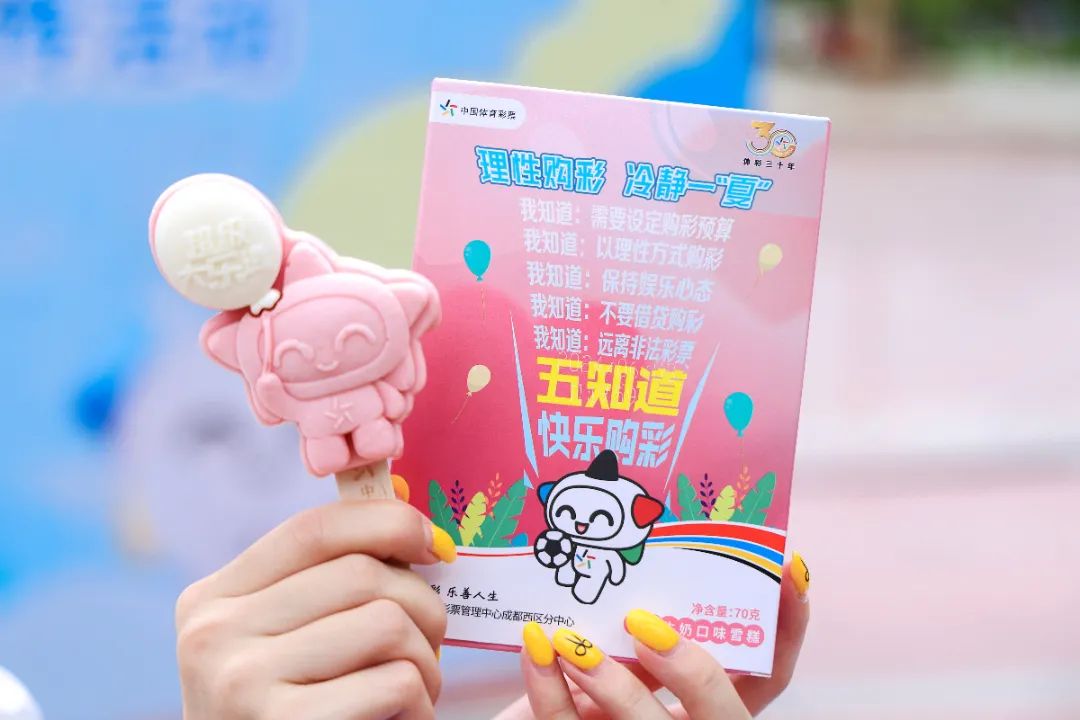 在四川,成都體彩西區分中心在轄區七個區縣的26個實體店開展了“理性購彩,冷靜一‘夏’”主題宣傳活動,他們采購定制了以體彩樂小星為主題的雪糕,包裝盒上醒目地印著快樂購彩“五知道”的溫馨提示,用特別的方式提醒購彩者“冷靜”投注、理性購彩。