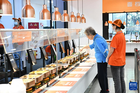 11月1日,75歲的陳鳳基(右二)在福田區益田社區數字食堂自助取餐。老人們通過小程序進行用戶注冊后,就餐時可實現通過AI人臉識別、自助稱重計價、即時無感支付。新華社記者 梁旭 攝