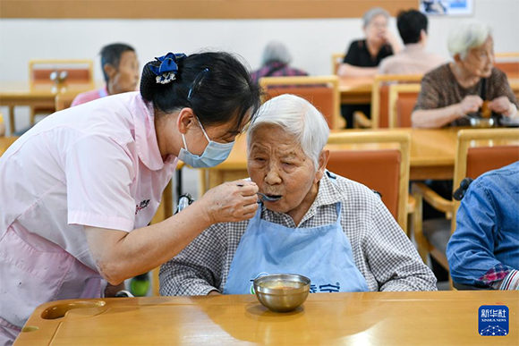 11月1日,在深圳市福田區福保街道長者服務中心(益田),工作人員喂老人喝湯。新華社記者 梁旭 攝