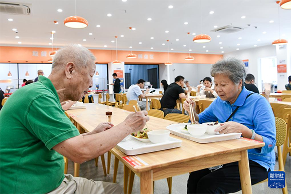 11月1日,陳鳳基(右)和石云山在深圳市福田區益田社區數字食堂就餐。新華社記者 梁旭 攝