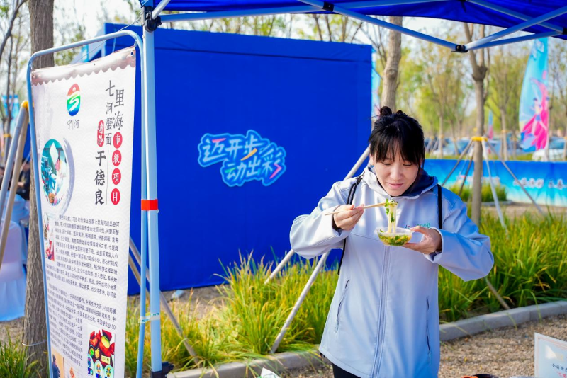 天津市非物質文化遺產、七里海河蟹面代表性傳承人于德良在活動現場支起“小吃攤”,湯汁鮮美的河蟹面吸引不少人品嘗、購買?!皝碣悎鰠⒄共惶摯诵?,我看到了奧運冠軍,還跟著走了一會兒鍛煉身體。最重要的是能讓更多人品嘗到七里海的鄉土特產,希望以后這樣的比賽能多一些?!庇诘铝颊f。
