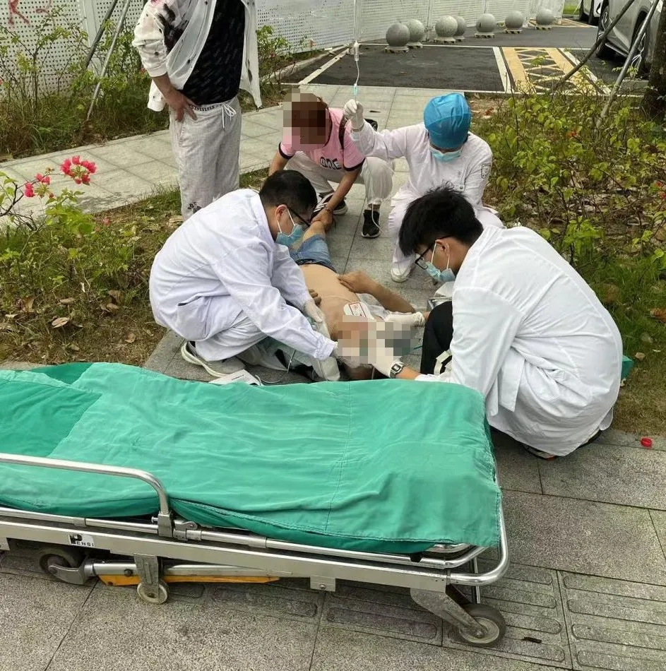 停車場主管周木旺發現后立即通知景區相關部門,報告游客暈倒位置。景區主管岑旭敏接到電話后立即趕往長盛旅店主樓一樓大廳,從旅店配置的“紅十字應急救護一體機”中取出AED(自動體外除顫儀),前往停車場進行救助。16點51分,岑旭敏等工作人員到達現場,發現該游客無自主呼吸、心跳停止,隨即使用AED進行除顫,同步對其進行胸外按壓和人工呼吸。在完成一組CPR(心肺復蘇術)后,暈倒游客恢復了呼吸,但未恢復意識。17點03分,開平市中心醫院救護車到達現場,對該游客進行檢查后立即送往醫院。晚上20點,景區工作人員與開平市中心醫院聯系得知,該游客確診為心臟驟停,經救治已完全恢復意識,景區工作人員的快速反應和正確處置為游客轉危為安贏得了寶貴時間。