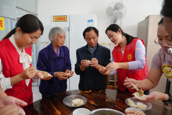在飯堂,志愿者和老人們圍坐在一起包餃子,鮮美的餃子下鍋煮熟后,志愿者攙扶行動不便的老人坐好,把熱氣騰騰的餃子端給他們?!昂贸?!”“再添一碗!”歡聲笑語回蕩在院內每個角落。