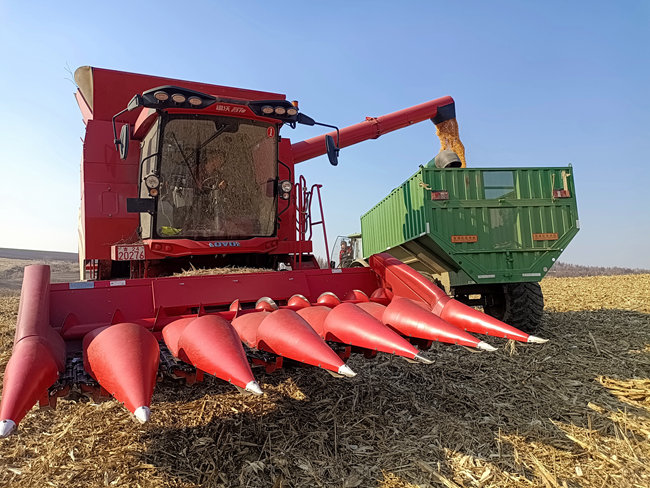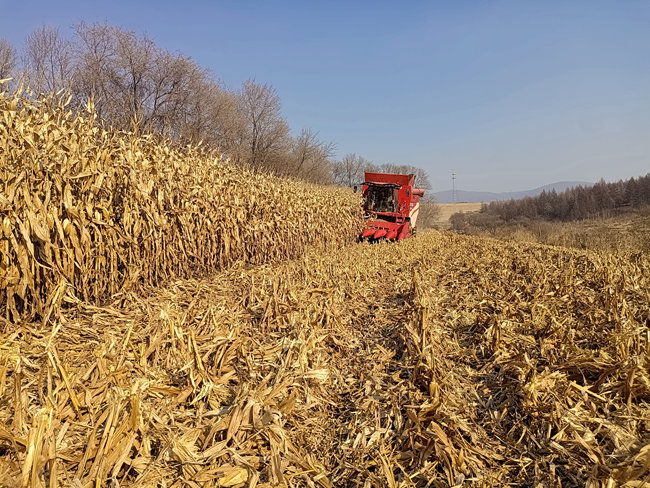 玉米喜豐收,金黃糧滿倉。在圖們市涼水鎮的玉米地,只見玉米已采收完畢,只留下滿地玉米秸稈。一臺大型秸稈收割機正在作業,將一排排玉米秸稈卷入機器粉碎后,傳輸到運輸車,運往圖們市德鑫農業服務有限公司。