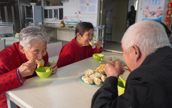 老人們在改造后的食堂吃著熱氣騰騰的餃子