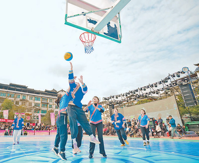 貴州省黔東南苗族侗族自治州,群山環抱著雷山縣,木鼓廣場上的銀飾叮當聲此起彼伏,苗族少女的裙擺隨著音樂飛舞,侗族大歌的和聲在山谷間回蕩……廣場中央的籃球場上,一場別開生面的“姑媽籃球賽”如火如荼。