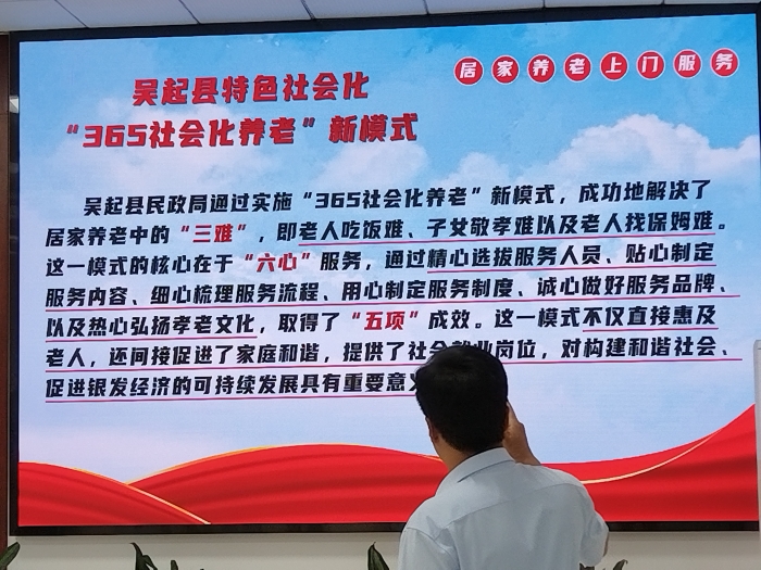 吳起縣民政局以家庭養老為基、社區養老為依、機構養老為補,形成“9073”模式,即90%的老人居家養老、7%的老人社區養老、3%的老人選擇機構養老,開創了以公辦養老服務機構為依托,將公辦養老服務機構逐步推向社會化的新舉措,吳起縣居家養老上門服務中心于2024年4月正式啟動掛牌運營,創新開展居家養老上門有償低價服務活動,蹚出了養老服務發展的新路子。